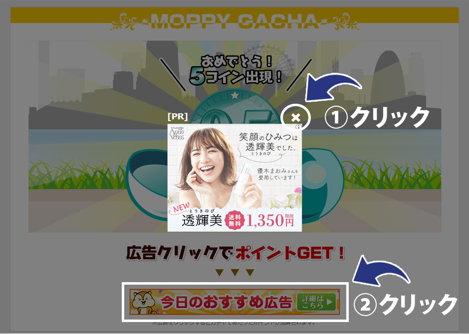注意点はガチャの後に広告のバナーをクリックしないとポイントがもらえないので、クリックするのを忘れないでくださいね。