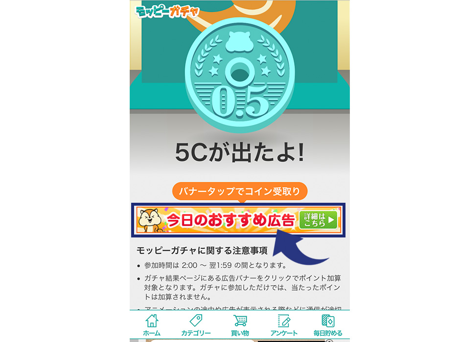 5コインが出たので、下の「今日のおすすめ広告」をタップして5コインを受け取ります。