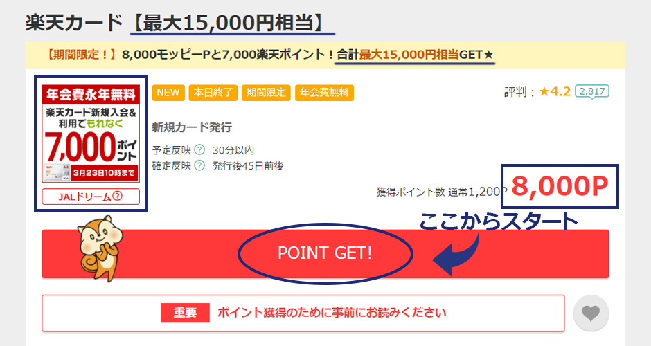たとえば、楽天カードをモッピー経由で申し込むと楽天からの7000ポイントとモッピーの8000ポイントの合計15000ポイントを獲得できるのです。クレジットカードを作るだけで15000円分のポイントがもらえるんですよ!すごいですよね~!これを利用しない手はないですよね!
