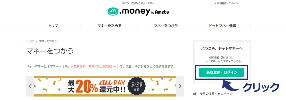 まずはドットマネーの登録ページから、「新規登録・ログイン」をクリックします。