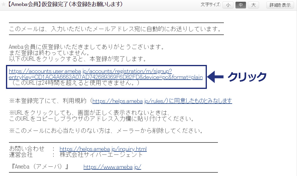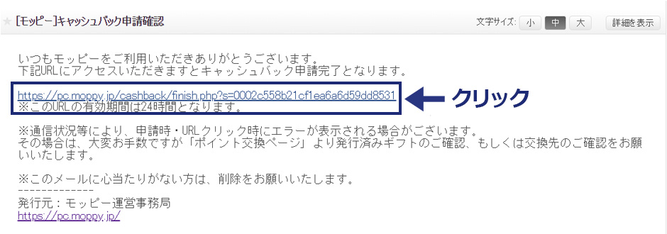 メールに記載されたアドレスをクリックして