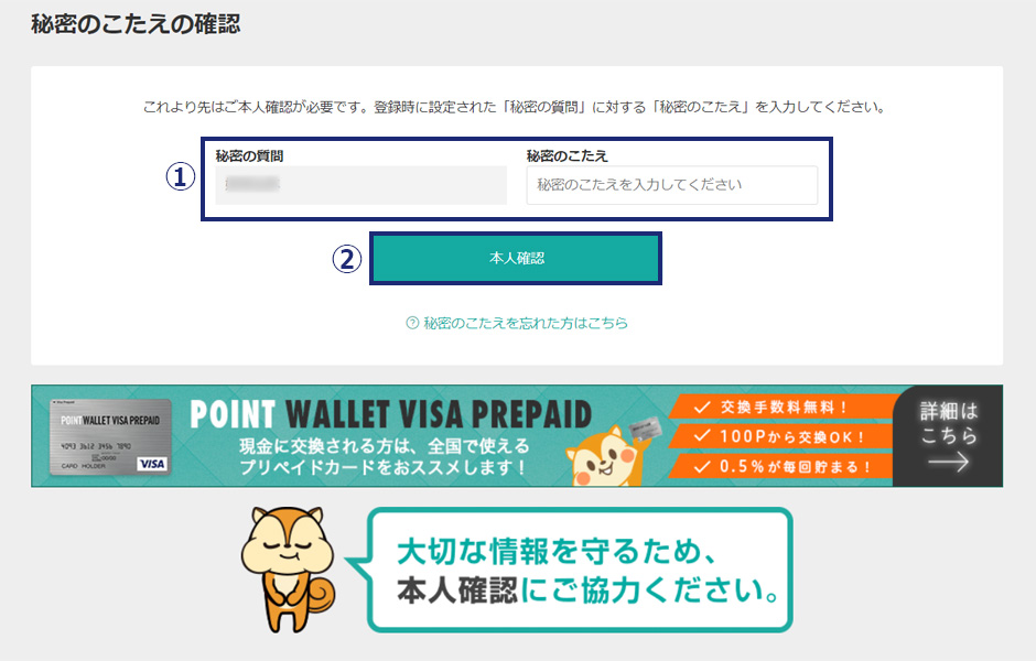 モッピーに登録したときに設定した秘密の質問と秘密のこたえを入力して「本人確認」をクリックします。