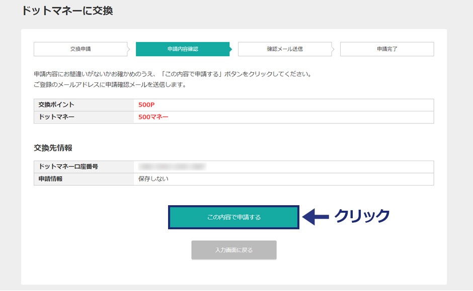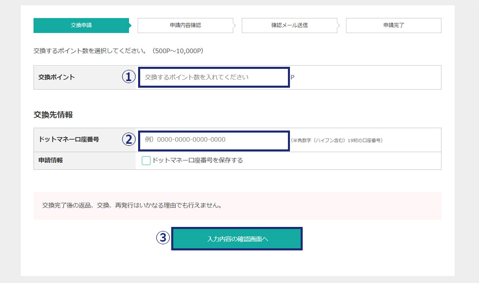 次は交換の申請です。交換するポイント数とドットマネーの口座番号を入力します。