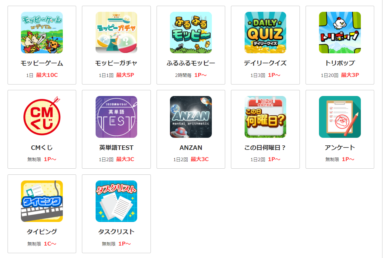 モッピーガチャのほかにもいろいろなゲームが用意されているので、楽しく遊びながらポイントを貯めることができます。